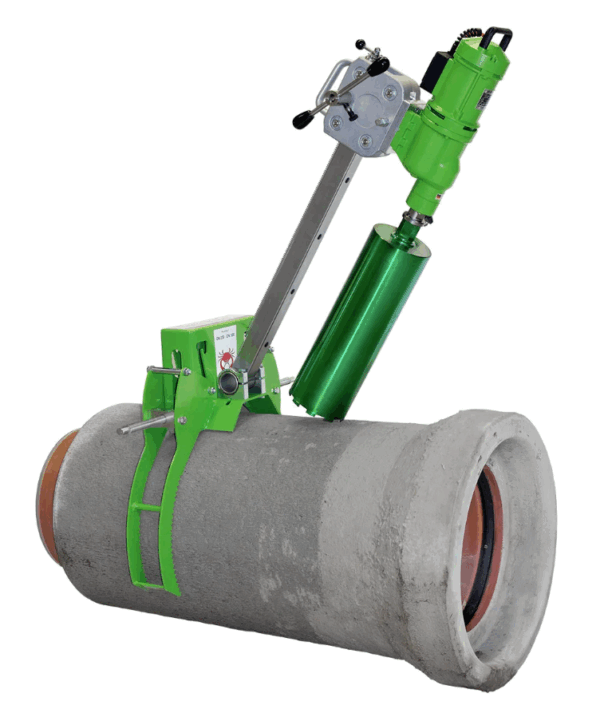 Diese Vorrichtung dient zur Befestigung eines Kernbohrgerätes auf Rohren (DN250-500) mit einem Außendurchmesser von bis zu Ø 630 mm mit wenigen Handgriffen und ohne Hilfsmittel. Auf größeren Rohren kann dieses Kernbohrsystem mit zwei mitgelieferten Spanngurten befestigt werden.